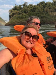 O casal Leyraud no passeio de bote que literalmente toma banho sob as Cataratas do Iguaçu.