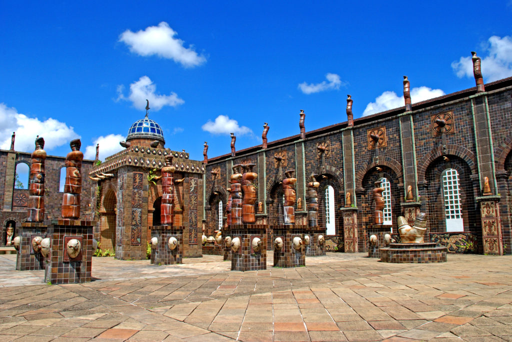 A capela cristã, por exemplo, convive com figuras da mitologia greco-romana, lagartos, basiliscos, monstros e um Templo do Sacrifício que remete ao massacre das civilizações pré-colombianas. Para completar, em todo o complexo está presente a marca da oficina que traz a imagem do arco e da flecha de Oxóssi, uma das divindades africanas.